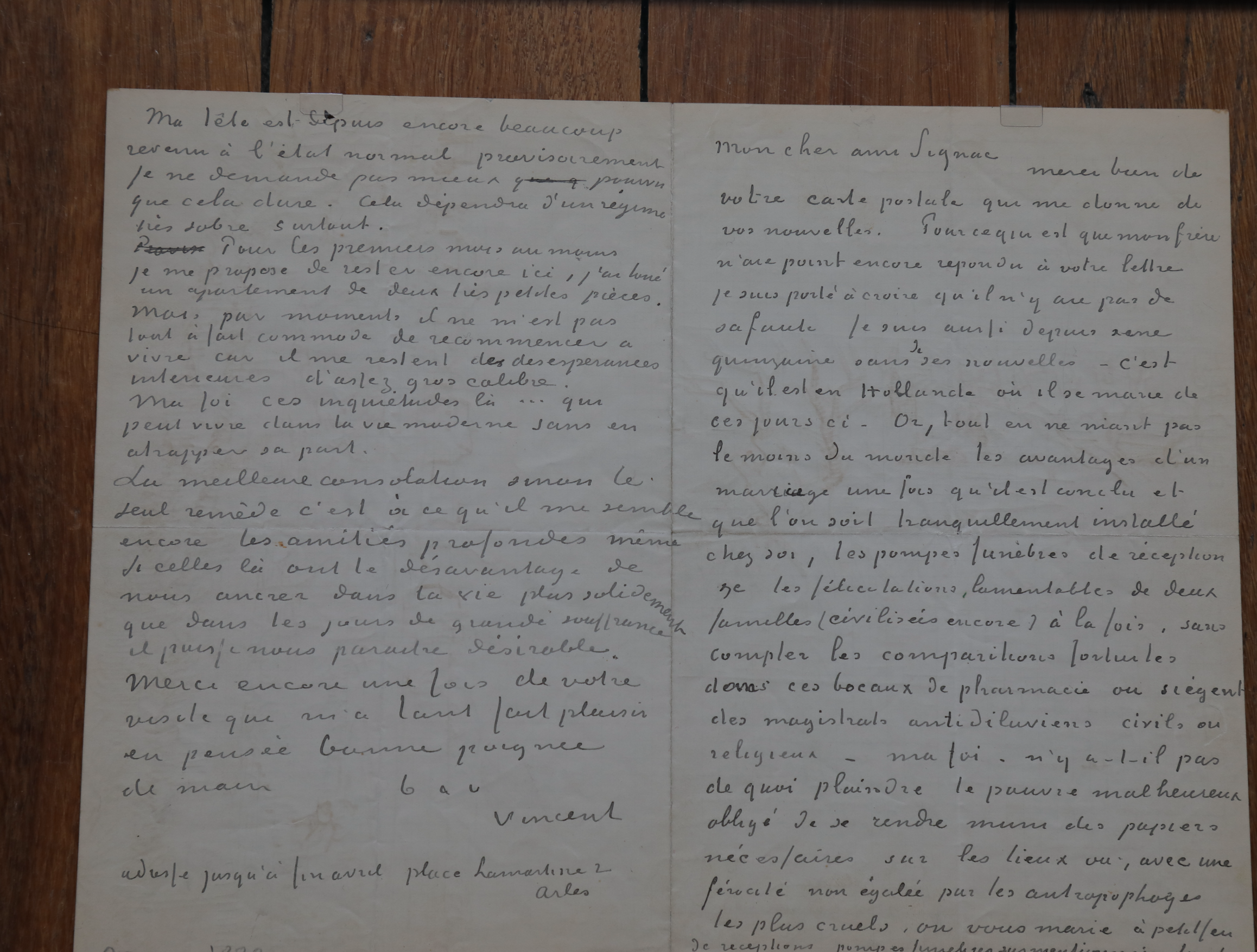 « Mon cher ami Signac, Je vous demeure bien obligé de votre si amicale et bienfaisante visite qui a considérablement contribué à me remonter le moral. (…) Mais par moments, il ne m’est pas commode de recommencer à vivre car il me reste des désespérances intérieures d’assez gros calibre.(…) La meilleure consolation sinon le seul remède c’est à ce qu’il me semble les amitiés profondes même si celles-là ont le désavantage de nous ancrer dans la vie plus solidement que, dans les jours de grande souffrance, il puisse nous paraitre désirable. Merci encore une fois de votre visite qui m’a fait tant plaisir. En pensée bonne poignée de main, Vincent. »